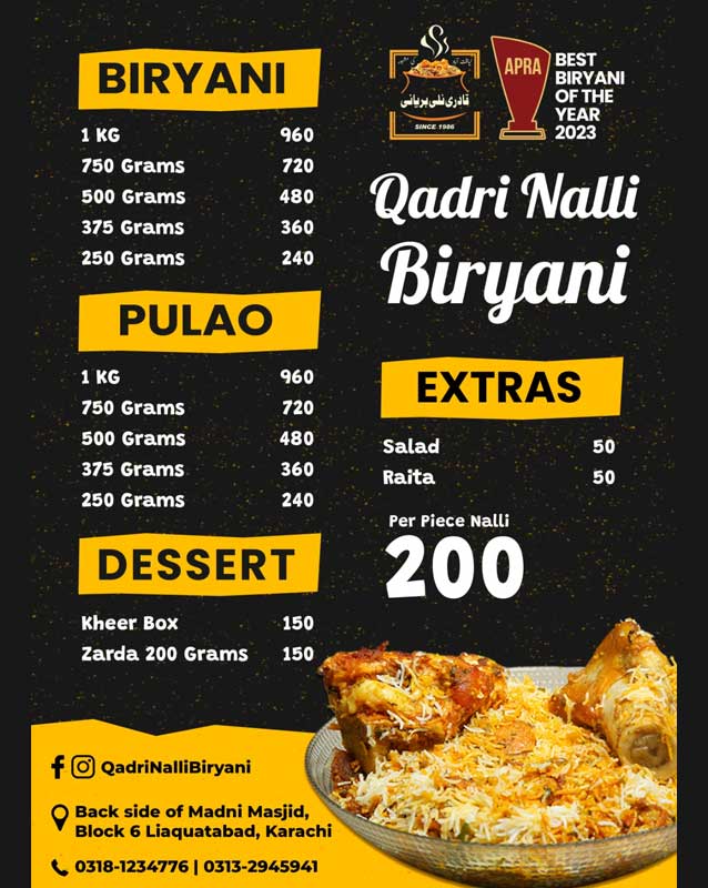 • Liaquatabad Karachi Branch Qadri Nalli Biryani - Back side of Madni Masjid, Block 6, Liaquatabad Town Karachi - Pakistan +923181234776
